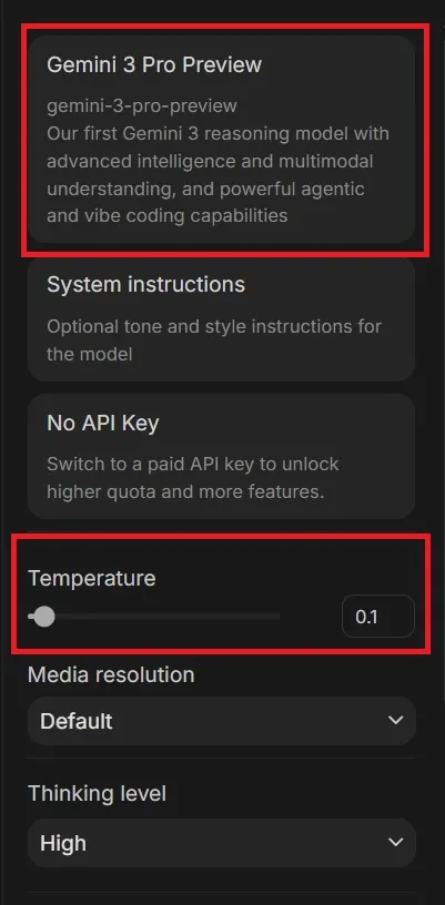 「Model:Gemini 3 Pro」×「Temperature:0」に固まりました。