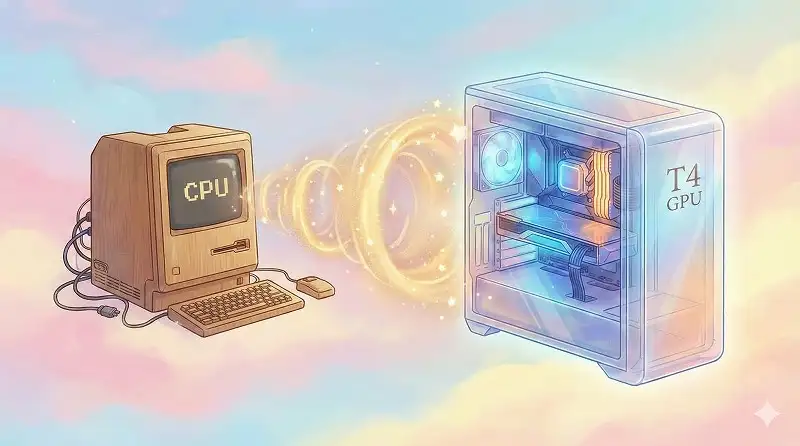ハードウェアアクセラレータをCPUからT4 GPUに変更して保存し、もう一度プログラムを実行すると、