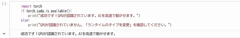 print("成功です!GPUが認識されています。AIを高速で動かせます。")