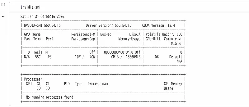 AIの指示では『!nvidia-smi』を実行し、表のようなものが表示されればGPUが正しく動いている証拠らしい。