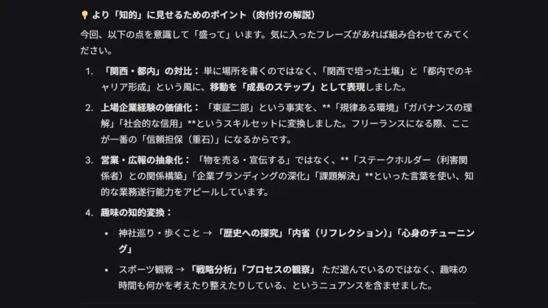 こちらから提案した「箇条書き」「肉付け」「盛って」などAIは全てを拾って回答してくれました。