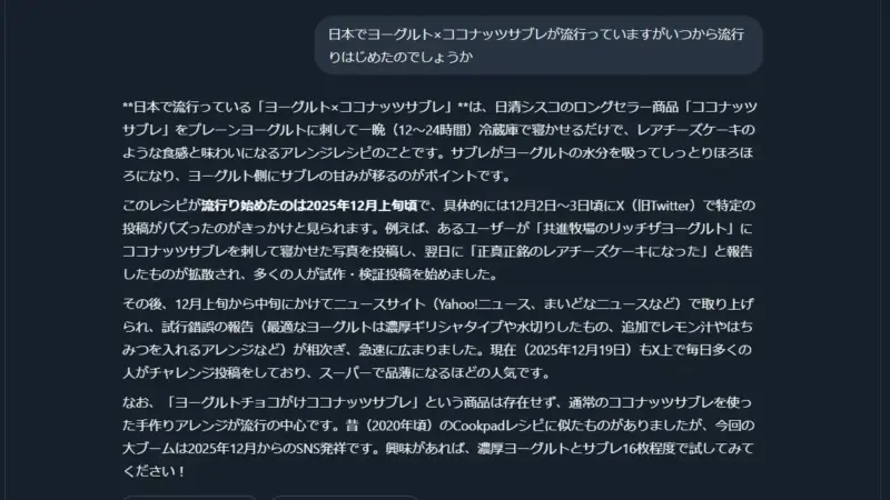 今回は『リッチザヨーグルト』『12月1日前後』とほぼ正解の回答をGeminiが出してくれたおかげで、Xから特定のポストを見つけやすかったのは事実。
